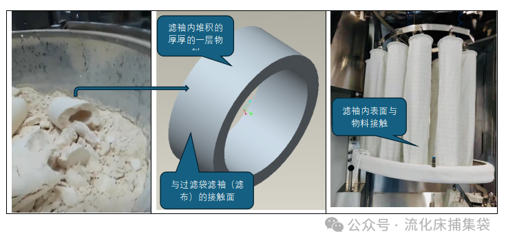 大家看到锅体中那个“圆筒”,是在生产过程中物料长时间在滤袖内累积形成的。滤袖里一张张厚厚的 “环形饼”会影响到流化床的正常作业,极大的增加了风机的负担,降低了生产效率,甚至会影响产品质量。在流化床制粒和干燥工艺中,滤袖内壁上多少都会有物料依附,但可以通过抖动或者反吹去除。正常情况下,是不应该出现此类情况的。