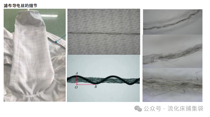对于过滤袋而言,也存在这样导走静电的连线。这就是大家见到滤布上深色的丝线,一般为316不锈钢和碳纤维材质,和纤维编织在一起形成经纱和纬纱。含有导电丝的纱线与常规纱线按一定的设计编织成滤布,呈现各种网格形状,过滤袋表面的静电通过这些导电丝与流化床相关的金属构件形成通路然后导走,便于表面的细粉脱落。导电丝很细,有电阻,电阻越小,导电效果越好。导电丝电阻不等同于滤布表面电阻,如果导电丝电阻大,可以增加导电丝的使用,加密后导电丝之间的网格变小,降低滤布整体表面电阻,提升导静电效果。在滤布的data sheet上,一般会用10的几次方来表示其表面电阻。