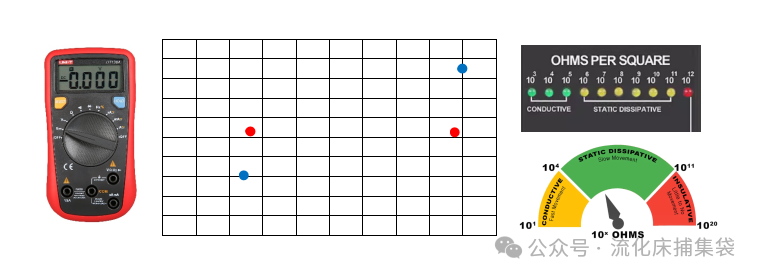 另外,在没有上述专门电阻仪的时候,或者是使用上述仪表测不出来的时候,我们也可以使用万用表来粗略对比滤布表面电阻大小。将万用调整到欧姆挡,用探针检测同一根导电丝(两个红点),或者检测交叉后的导电丝(两个蓝点)的电阻,通过测试获得数字级别(10的几次方)就可以对比了。